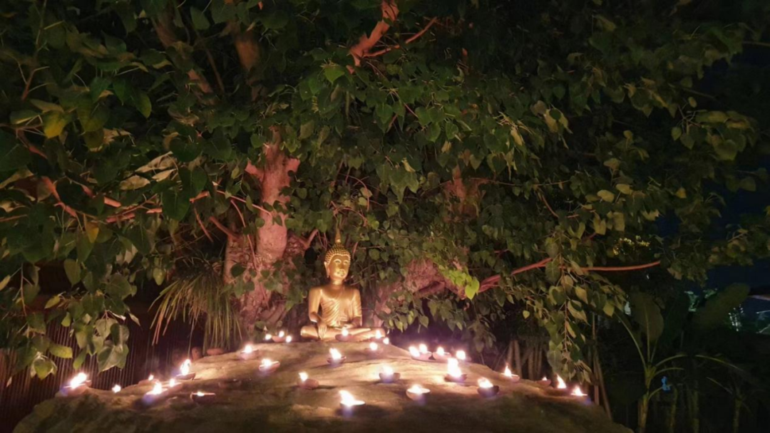 最喜欢的是盼道寺(下图拍摄于2021年水灯节),菩提树下,释迦牟尼在修行打坐,烛光与月色相互辉映。