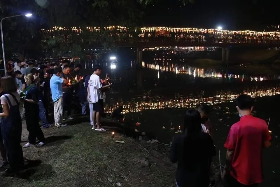南奔人们聚集到河边放水灯,不少人还身穿传统泰国服装,加上夜晚完全看不到什么现代化的建筑,只有纸灯的光亮,远处一片漆黑……