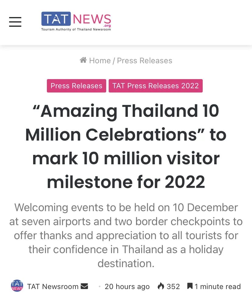 其实早在年初泰国旅游局就给自己定下了2022年实现1000万游客量的“小目标”,但当时受疫情影响,旅游业萧条,外界不怎么看好这个高攀不起愿望。