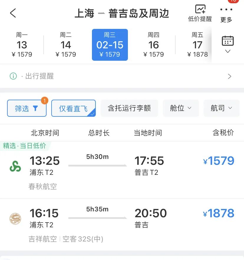 上海直飞普吉岛的航班好很多,好歹是真的直飞。