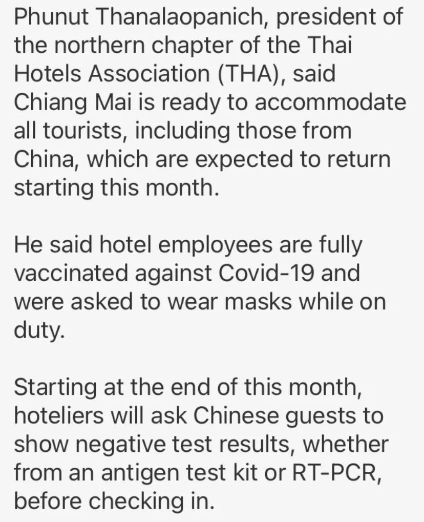 泰国酒店协会北部主席称,这个月底开始中国游客入住清迈酒店需要出示核酸阴性报告(可以是核酸检测,也可以是抗原测纸)。