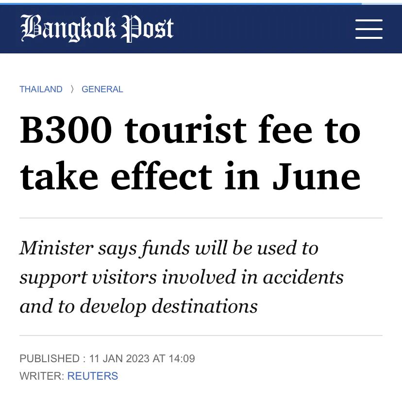 据泰国媒体《曼谷邮报》报道,泰国政府预计从今年6月开始向外国游客征收每人300泰铢的入境费。