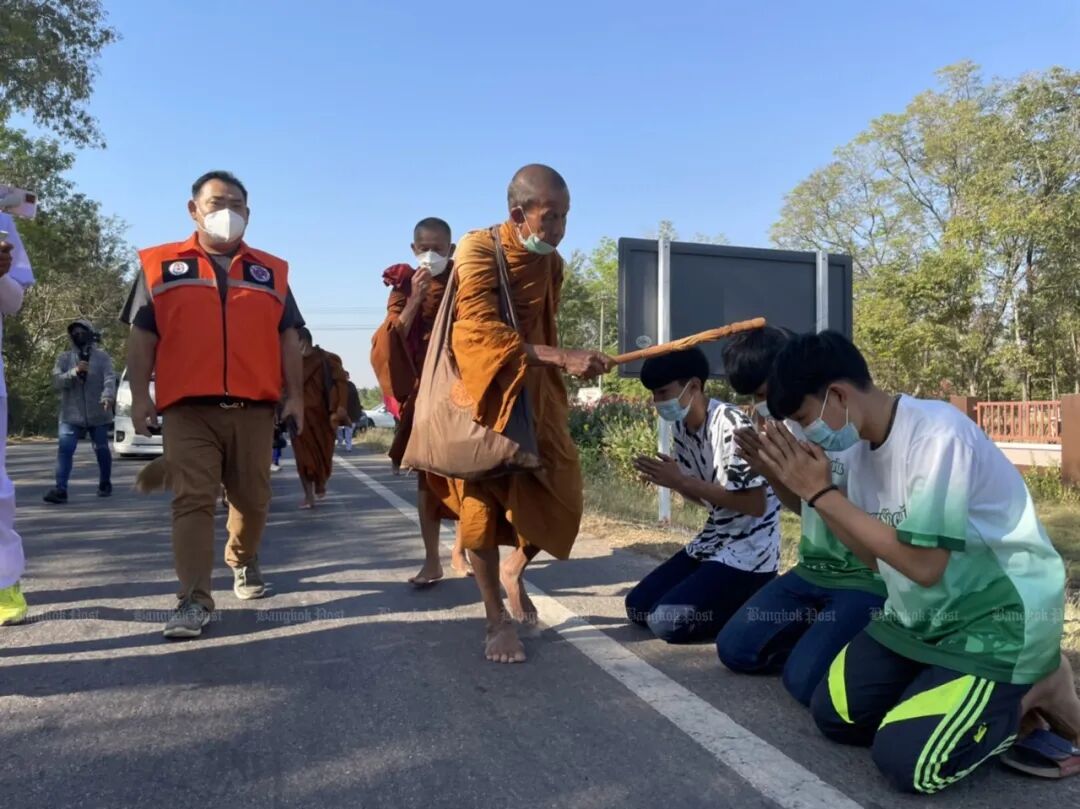 这位僧人今年已经72岁了,今天当他抵达呵叻府时,路边已经有许多人在路边等着他赐福。(即请高僧用随身携带的棍子悄悄拍一下他们的头,以求得好运)