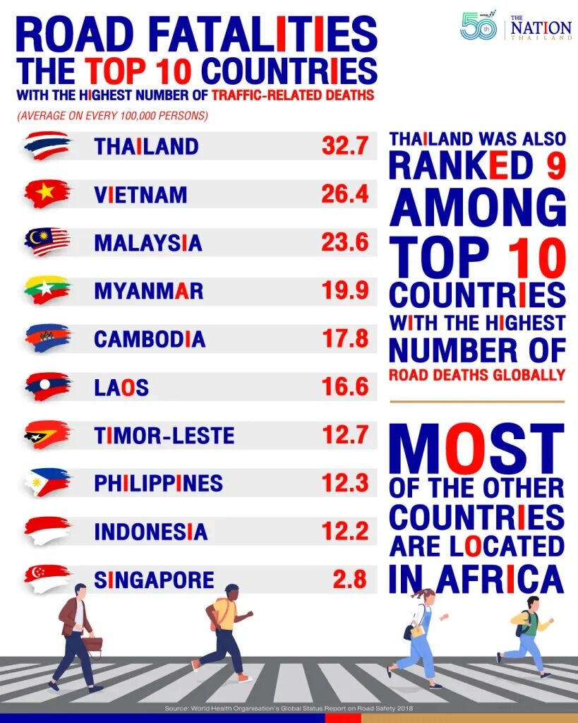 在世界卫生组织(WHO)一份报告中显示,泰国的道路是东南亚国家里最致命的,每年约有20000人死于交通事故。