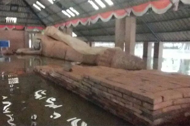 周日,位于泰国呵叻府历史遗迹公园内的泰国最古老的卧佛被洪水侵蚀。