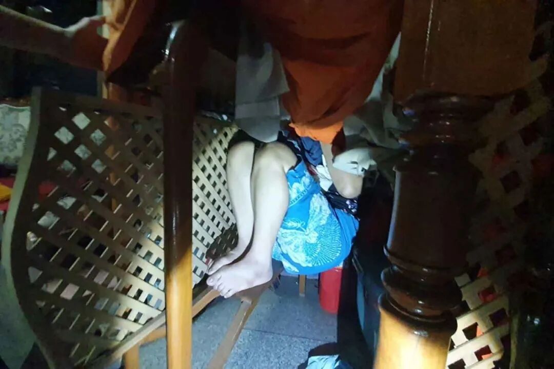 逮聊~一个面目苍白、双唇紧闭、瑟瑟发抖、且木有穿内裤的半裸女子真的躲在里面!