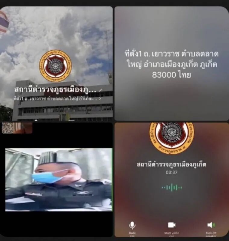 然后瑞士大爷就进入一个叫“Muang Phuket Provincial Police Station”的群,背景图就是普吉警察局,视频时,“普吉警察”穿着制服,戴着口罩,因为现在疫情,所以他也没有怀疑。(骗子利用背景图、制服、名字等进一步赢得信任,树立威严感)