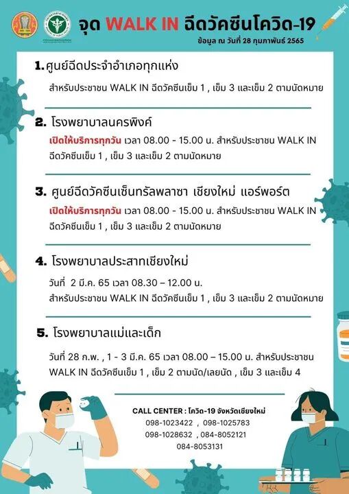 目前泰国几乎全境躺平,在清迈,有想打疫苗加强针的朋友,可以到以下几个点去打: