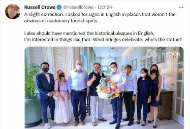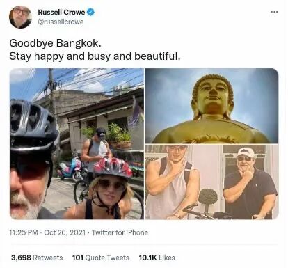 好莱坞著名男演员罗素克劳(Ruseel Crowe)近期正在泰国曼谷和普吉岛旅游。不像其他名流悄悄出行,他还很接地气地在个人推特上发了动态。