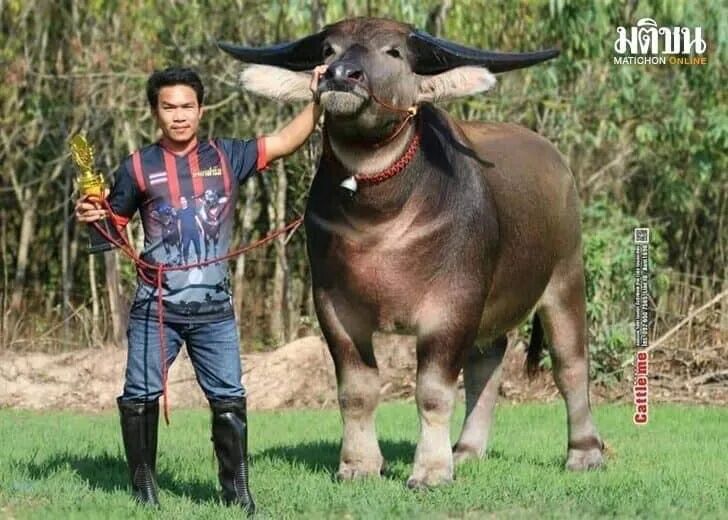 他的主人表示,这头漂亮的水牛在水牛选美比赛中赢得了冠军,有人出价700万泰铢想跟他买这头牛。