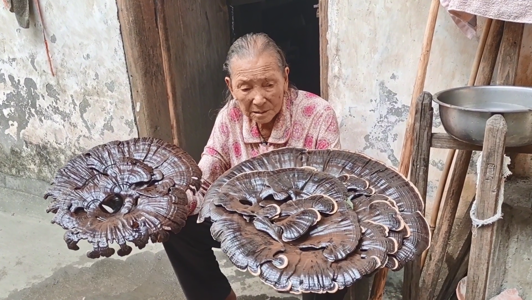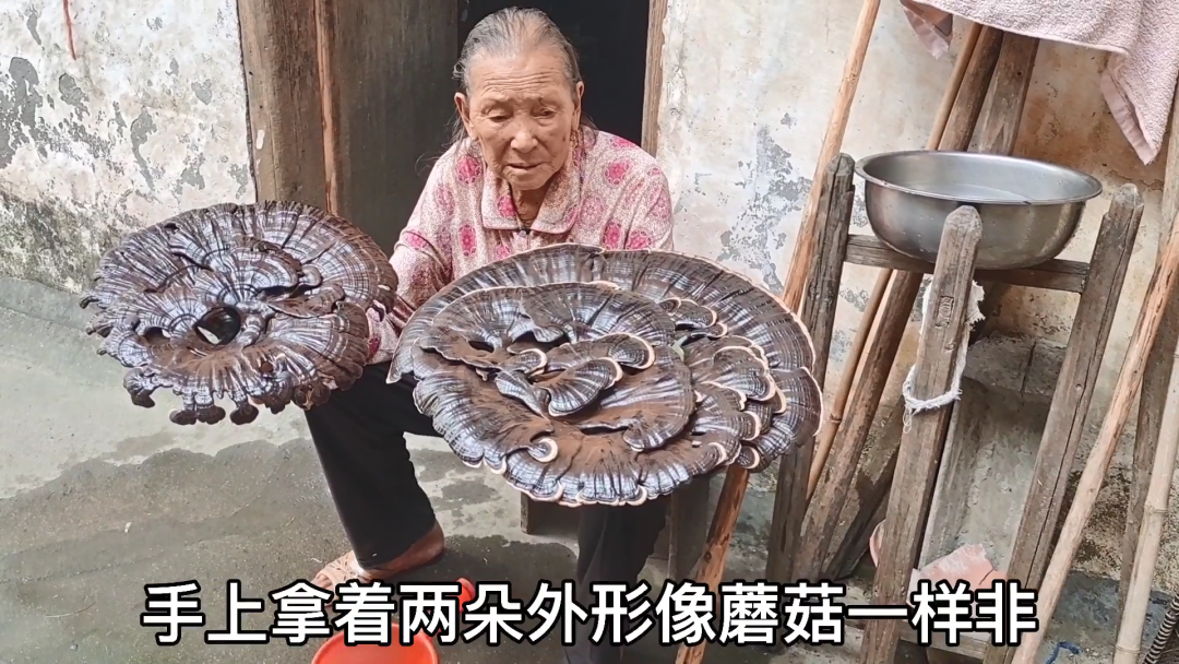 老奶奶说,这种色泽那么漂亮又那么大个的,它长势也是非常的久,而且是很难见的这种灵芝,它的药用价值也是非常高的,在我们这边很多懂的人一般会把它切开来,晒干之后用来煲猪脚是非常不错的。