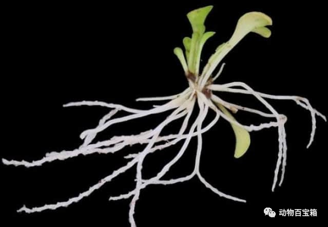 3.捕虫器严格地说,热带植物草是没有根的。但是挖开地面,会发现有些植物长着像树根一样的白色细长部分。实际上,这是一种叶子变形的捕虫器,具有圈套笼的功能。管状的捕虫器向下延伸,分叉成倒Y字,那里有400微米的开口,边缘有向内的刚毛,因此一旦进入就很难回头。猎物会进入更深处,在那里被酶消化,猎物是在土壤中生存的小型原生生物。