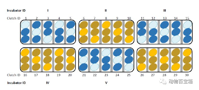 研究人员将鸡蛋分成三组放入孵化器中,每组都是实验组(黄色)或对照组(蓝色)。每组三个鸡蛋中的两个(鸡蛋以较深的颜色显示)每天四次从孵化器中取出并转移到隔音箱中。在实验组被移动的隔音箱中,播放了成年鸟类发出的警告声以表明即将到来的捕食行为的录音。对照组移动的隔音箱内没有听到任何声音。