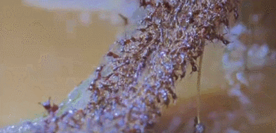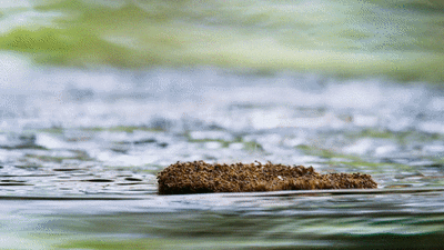那么这些规则是什么?“火蚁筏”为什么不沉?红火蚁原产于南美洲,是体型最大的火蚁种,一个群体约有30万只。当他们的地下隧道巢穴被淹时,他们会一起建造一个可以在地表漂浮数周的木筏。火蚁具有排斥水的拒水作用,它们可以在细毛之间积聚气泡。把每一个紧密连接起来,气泡就变大了,变成了一个巨大的浮环。2017 年 8 月,创纪录的飓风哈维袭击德克萨斯州时,被洪水淹没的城镇中到处都是火蚁筏。这是它的样子。乍看之下,像是一团漂浮的泥土,但仔细一看,却能看到无数火蚁在蠕动。