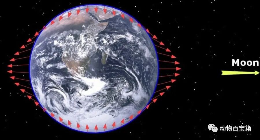 这一次,我将解释这样一个移动的月亮。为什么月球要远离地球?目前月球绕地球运行的轨道直径约为 768,000 公里。然而,这个距离每年增加 3.8 厘米。月球实际上正在远离地球的故事很有名,所以很多人可能都听说过。那么为什么会这样呢?要了解其中的原因,我们首先需要了解什么是潮汐力。什么是潮汐力潮汐力类似于万有引力,但要复杂一些。重力在太空中的作用并不均匀,因为它离重力源越远就越弱。因此,当月球的引力作用于地球这样的巨大物体时,靠近月球的正面方向受到强烈的拉动,而对面的拉动则没有那么大。这就像拉一个一端固定的橡皮球。这时候,橡皮球是前后拉伸的,但你能想象上、下、左、右都被压扁了吗?这样,月球的引力就对地球施加了一个力,如上图所示。