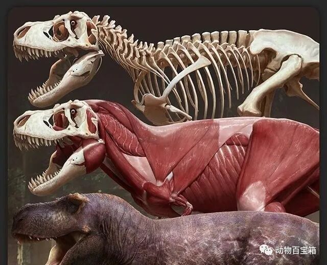 最早的理论是“在交配过程中起到固定雌性的紧固件的作用”。帕迪亚纳认为,霸王龙的手臂太短,无法抓住女性的躯干,也太虚弱而无法控制她。在接下来的一个世纪中,出现了各种理论。有科学家提出以下观点:- 吸引伴侣的社交信号・从地面站起来时的支撑・推下猎物・像喇叭一样刺向敌人- 晚上拉下睡觉的三角龙等等。另外,也有专家说“手臂完全没有功能,不用担心。 ”通过这种方式,研究人员似乎认为霸王龙的手臂非常虚弱,以至于它们退化了,因为它们没有任何用途。与其说它体积小,不如说它的短臂使用有限。话虽如此,就算是因为不使用而退化了,但从体质来看,手臂大小的变化似乎太过极端了。出于这个原因,最近的理论表明,较小的尺寸更有利于快速撕裂猎物。基于这些事实,帕迪亚纳根据近年来曝光的、关于霸王龙的新事实,提出了一种新的理论。为了不“咬断胳膊”,集体吃饭帕迪亚纳的新理论基于最近的研究,该研究表明霸王龙是“成群捕猎”,而不是像虚构的那样单独捕猎。