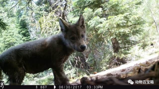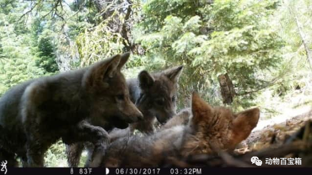 而且,当时的学者们做梦也没想到第二年会有更可喜的发现。 雌性分娩,生了3只宝宝。 今年5月,该州鱼类和野生动物保护局的生物学家狄安娜·克里福德暂时捕获了那对雌狼,并给它们戴上了带有追踪装置的项圈。 身为兽医的克利福德,在当时对雌狼进行的身体检查中,发现她在春天生产,第二天,在森林中发现了幼狼的小脚印。 之后没过几天,森林里的摄像机记录下了狼的一家和3只狼的孩子。这才是学者们寻找的野狼应有的姿态。