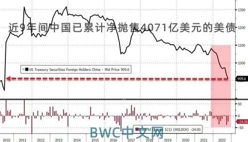 更加值得注意的是,BWC中文网查询美国财政部历史数据注意到,最为明显的一个新变化是,中国在2013年11月当时持有美国国债总额达1.3167万亿美元,再对比最新持仓的9096亿美元,可以看出,近9年间,已经累计净抛售了规模高达4071亿美元的美国国债。累计净抛售比例约为31%,而这一累计抛售规模比美债第四大持有国比利时持有的3273亿美债总量还要多出798亿,仅次于美债第三大持有国英国持有的美债数量。