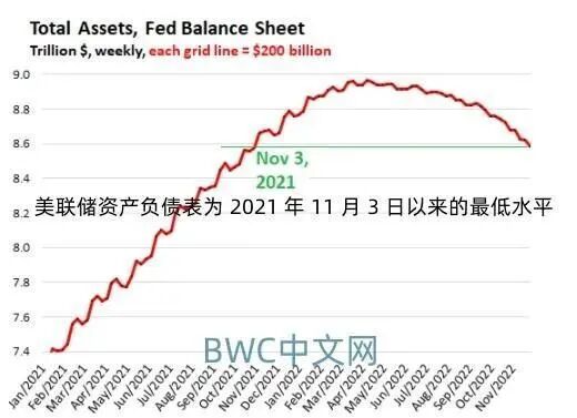 与此同时,美联储的资产负债表显示,截至 11 月末,美联储资产负债表上的总资产自 4 月达到峰值以来,减少了 3810 亿美元,至 8.585 万亿美元,为 2021 年 11 月 3 日以来的最低水平 。