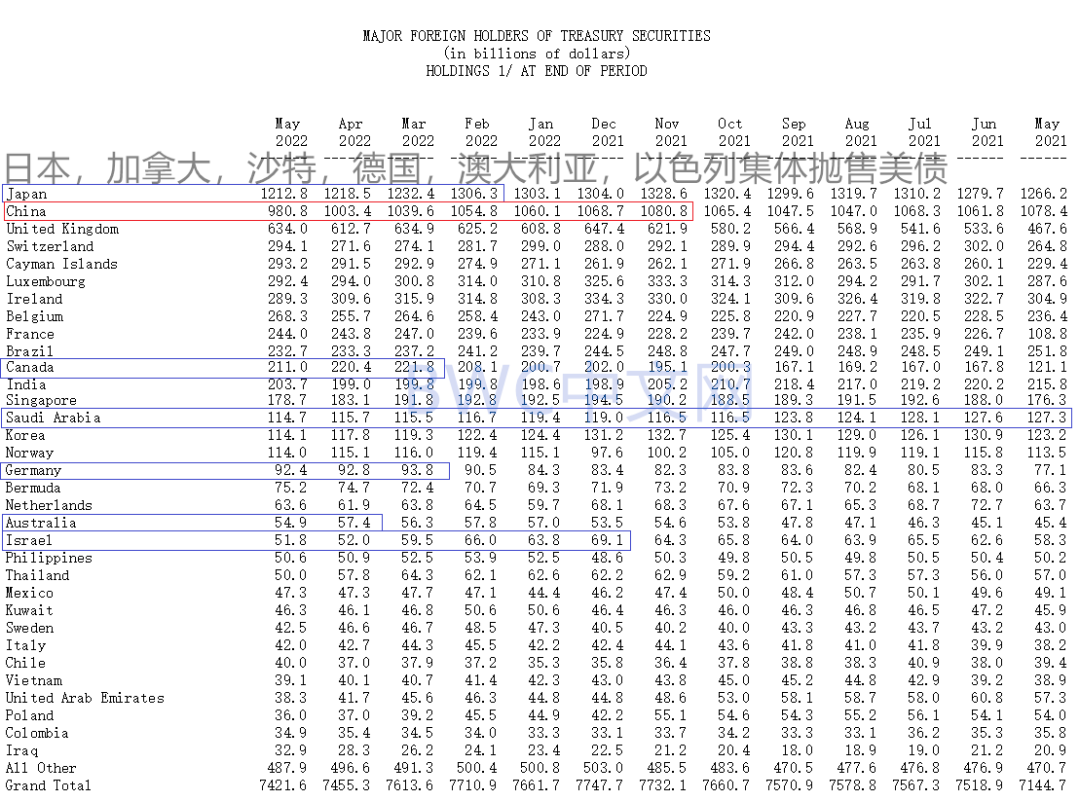 根据美国财政部7月下旬公布的最新一期国际资本流动报告(该数据延后两个月习惯例)显示,日本,加拿大,沙特,德国,澳大利亚,以色列这6国都在5月集体抛售了美国国债。