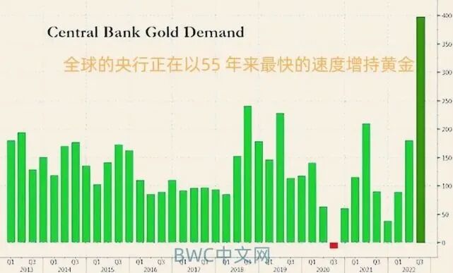 据世界黄金协会 (WGC) 的数据,今年前三季度,全球央行购金总量提升至673吨,高于1967年以来的所有全年总量。全球的央行正在以55 年来最快的速度增持黄金。在三季度购买了创纪录的 399 吨黄金,全球对贵金属的需求回到了大流行前的水平。
