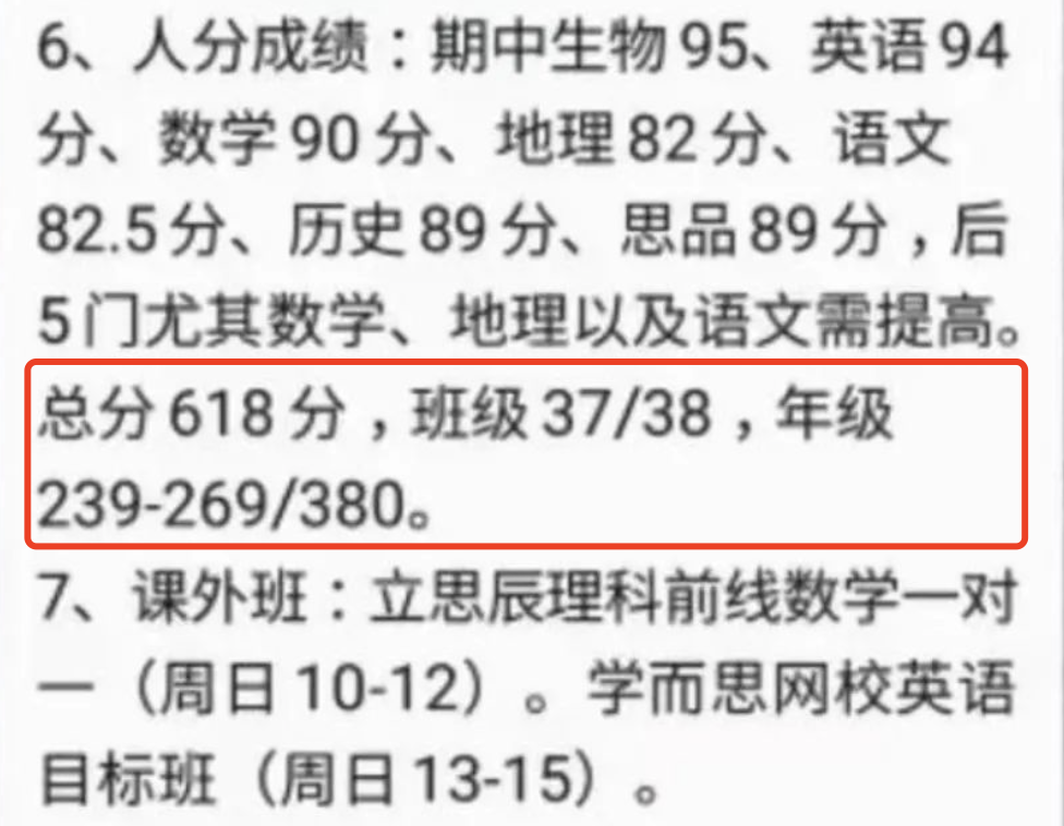 课外活动如此突出,学科总分已经达到618分了,在海淀某学校里也就是班级倒数第二名,年级末尾的成绩。