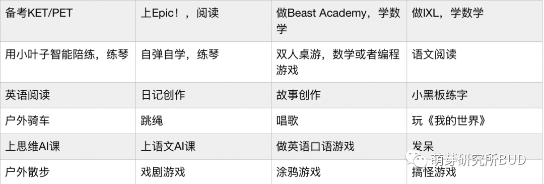 比如我这段时间拉着孩子砍兴趣班,把留白时间从每周大概6小时,增加到了12个小时。留白时间做什么,我跟孩子把感兴趣的活动都放进Excel表里,机动选、不重复地选,持续更新:▼