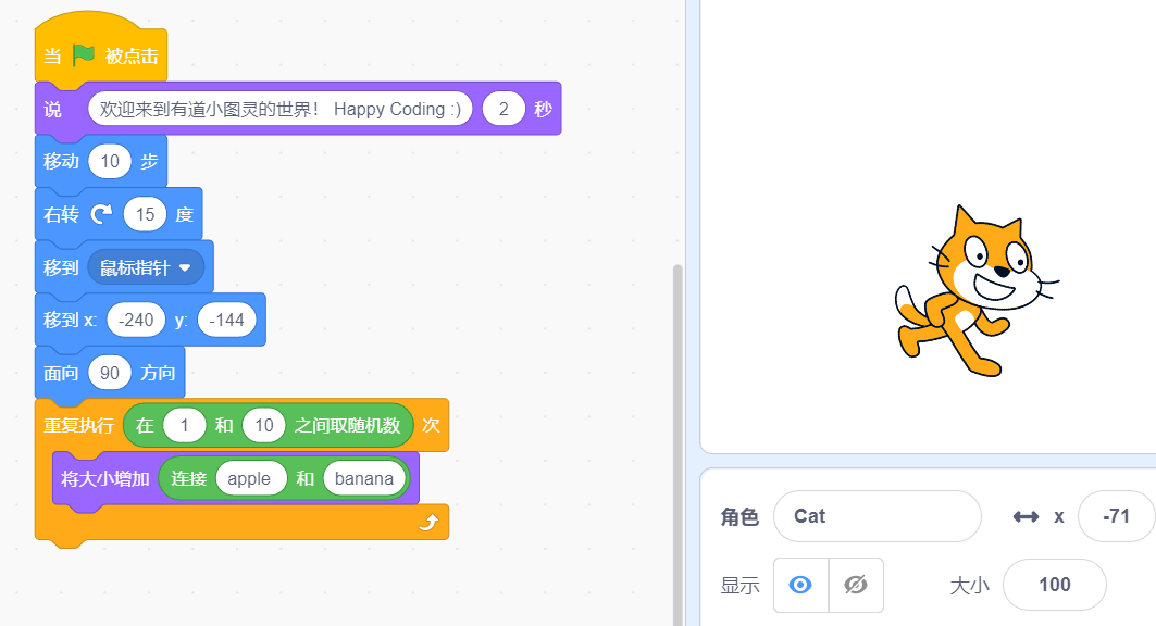 另外,如果仔细看上面的命令语句,还可以发现,数字、加减法、大小比较、方位、XY坐标等等数学知识,也被运用到了积木的搭建中。这些不同定义和数值的组合,也决定了Scratch的发挥空间是非常大的。
