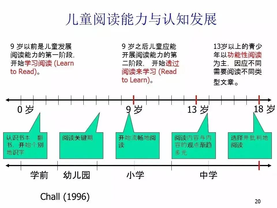 首先,我们来看下美国的Chall教授提出的“儿童阅读能力与认知发展”的时间轴。可以看到幼儿园、小学低年级和小学中高年级的阅读能力发展期的侧重点是有所不同的。