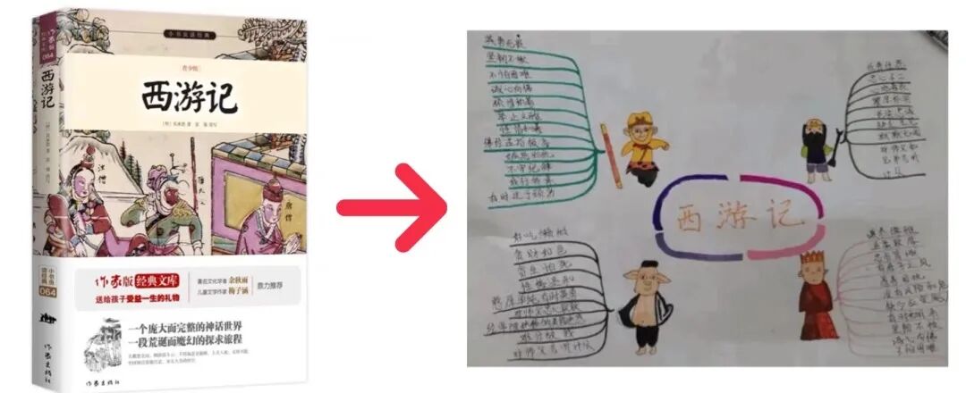 除了交流,还有一个好方法是适合总结一本书的,那就是思维导图。孩子在阅读后,可以用笔画一张思维导图,把故事的发展脉络、人物的关系图、情感记录下来,做到一个精简的概括。