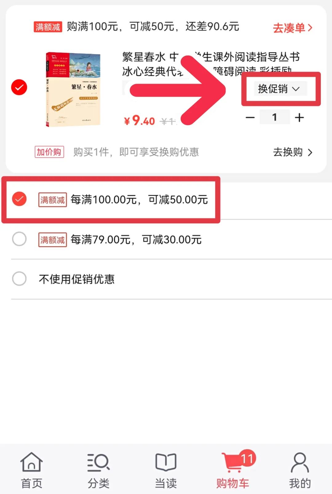 4、从购物车勾选书单查看促销活动是否是最优选项,记得一定要勾选为“每满100元,可减50元”。