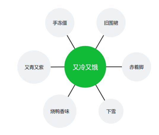 顺着导图,我们可以想象天上下着雪,小姑娘赤着脚,冻得青一块紫一块,小手也几乎要冻僵了,只穿着旧围裙,闻着街上飘着的烤鸭的香味的样子。