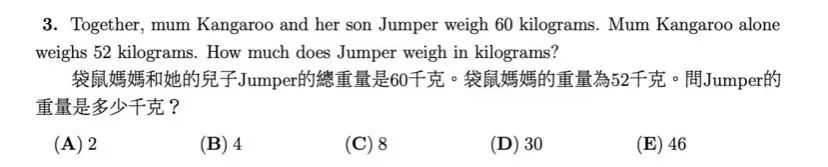 袋鼠妈妈和儿子的重量一共是60公斤,袋鼠妈妈的重量为52公斤,问小袋鼠多重?(小学低年级真题)
