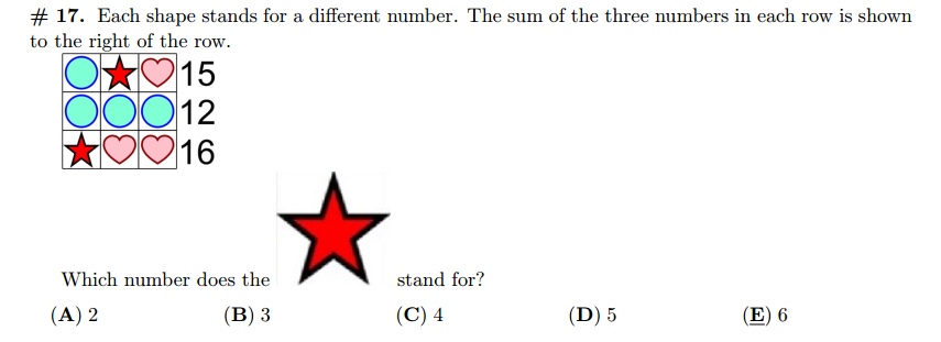 每个图形代表不同的数字。每行的三个图形之和显示在这行的右边。请问红星代表什么数字?(小学中年级)