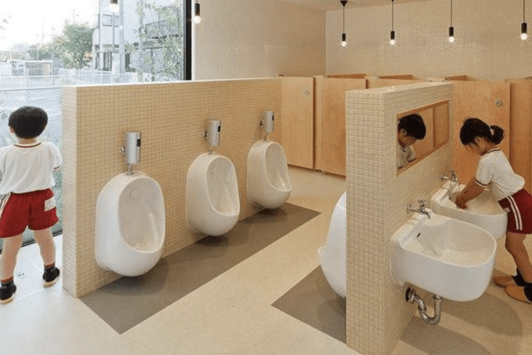 我朋友已经在率先考虑在家里试行“幼儿园”制度的,比如厕所已经在参考这样子的设计了:▼