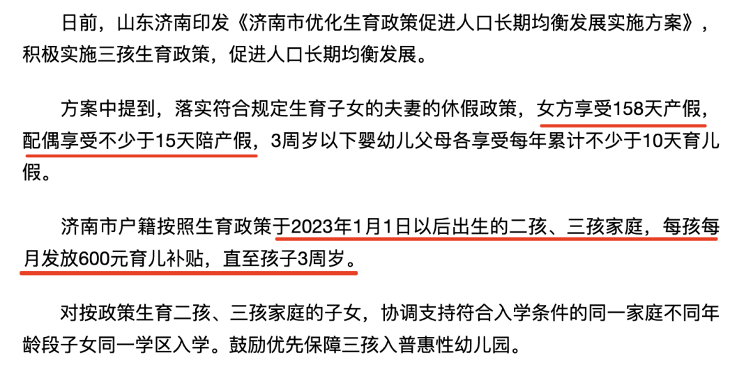 山东省的济南对二孩、三孩家庭每月都至少补贴600元,直到孩子们三周岁。▼