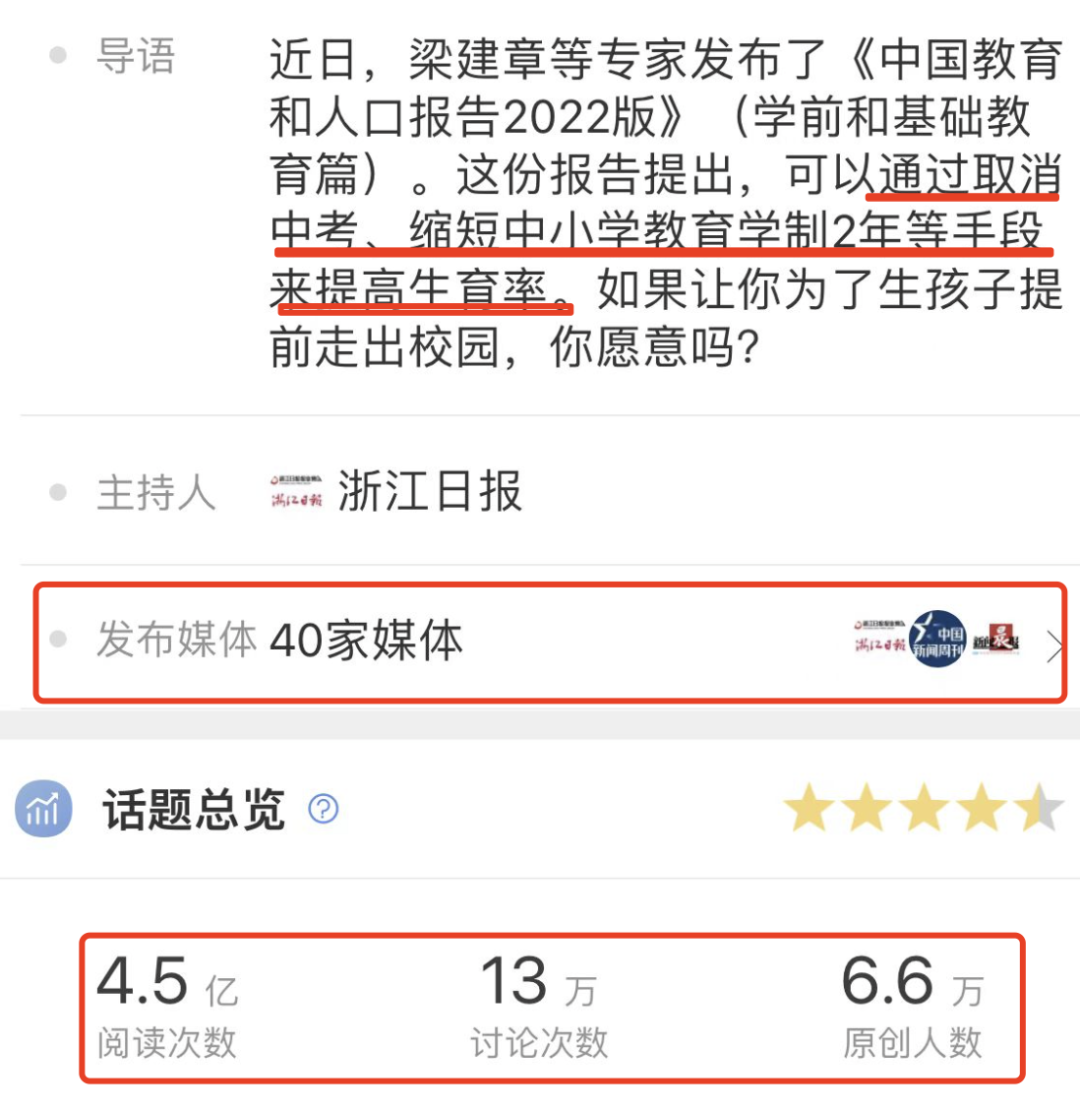 一个提案是这样子的,根据《中国教育和人口报告2022版》的调查,专家团队提议,要通过取消中考,缩短中小学教育学制2年等方法,提高生育率。▼