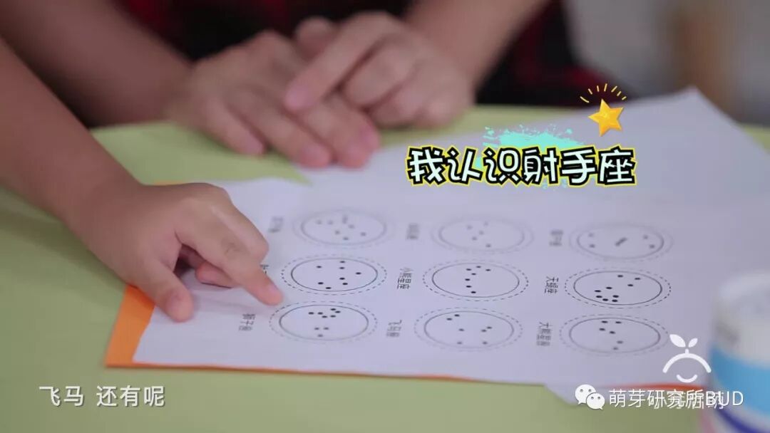 在了解各种星座形状的基础科普过程中,我们可以用一些直观的展示帮助孩子进行记忆。比如在3-4岁的「萌小芽早教」中,我跟Joshua一起玩过一个“认识星座”的游戏:▼