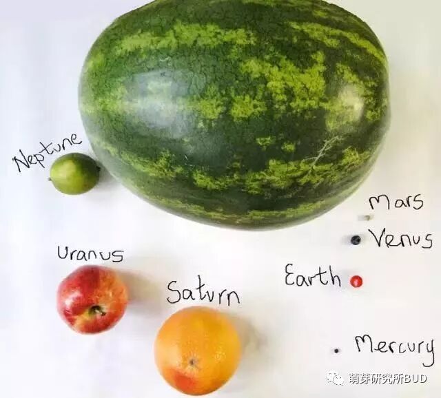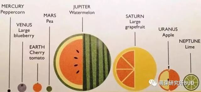 但是对于低幼的孩子来说,我们可以尝试把八大行星比作水果,这个比喻是不是连我们大人都会觉得十分有意思呢,同样的,孩子们认识起来就会容易得多。比如,把我们所在的地球当成是小番茄,其他的行星对应的就可能会是下面这些水果。▼