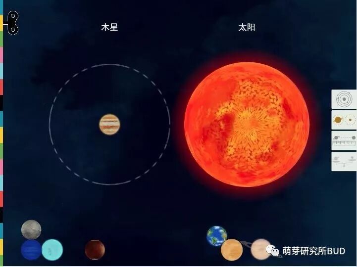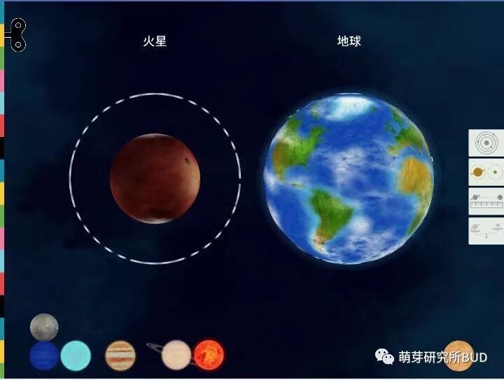 进入主界面后,只要点一下右边的菜单栏,拖动星球到圈圈里,就可以比较星球的大小:▼