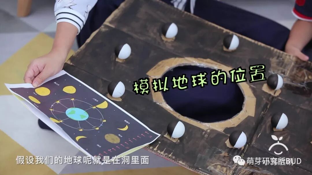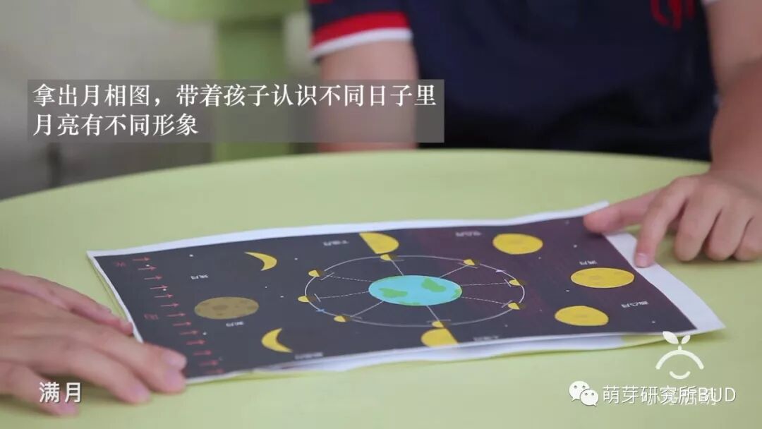 为了让孩子更直观的理解太阳光反射的影响,我们可以跟孩子一起动手做一个观察月相变化的手工游戏,比如在4-5岁的「萌小芽早教」中,我跟Joshua一起玩过一个“认识月相”的游戏::▼