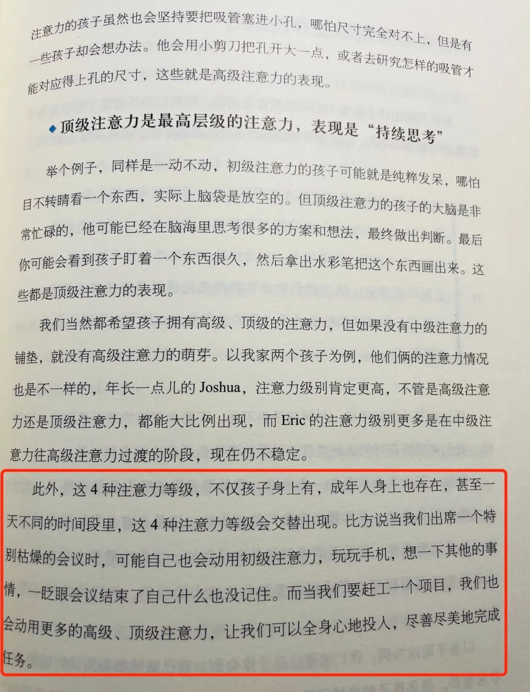 所以对于每一个家长和老师来说,最关键的并不是去等孩子有出现专注力问题的时候,送孩子去“训练”,而是要及时观察和发现孩子的专注力特点(就是我书里介绍过的那四种专注力形态),然后及早培养、及时调整。