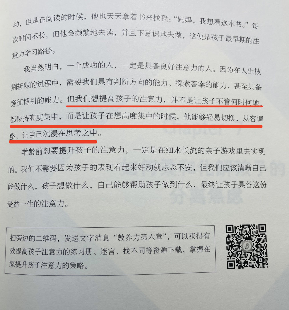 无论是成年人还是小朋友,专注力最好的状态我在《教养力》的书里就详细说过的了,那就是让孩子在想高度集中的时候,能够轻易切换注意力的不同等级,从而让自己有思考和沉淀的可能性。▼