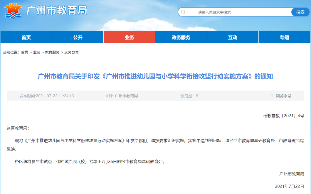 在《意见》发表之前,7月22日,广州已经印发《广州市推进幼儿园与小学科学衔接攻坚行动实施方案》,为幼儿园和小学的科学衔接做调整和准备。▼