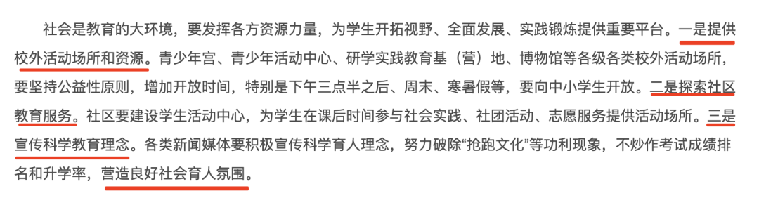 除了家庭之外,《意见》对社会职能也提出了规范,比如对校外活动场所和资源的要求,对探索社会教育服务的思考,以及对科学教育理念的宣传,破功利性、除“抢跑文化”,一起来营造良好社会育人氛围。▼
