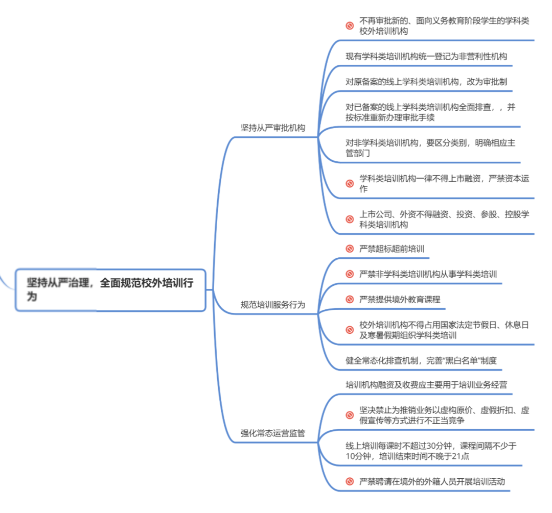 涉及到和校外培训方面相关的包括了从严审批机构、规范培训服务行为、强化常态运营监管这三方面。▼