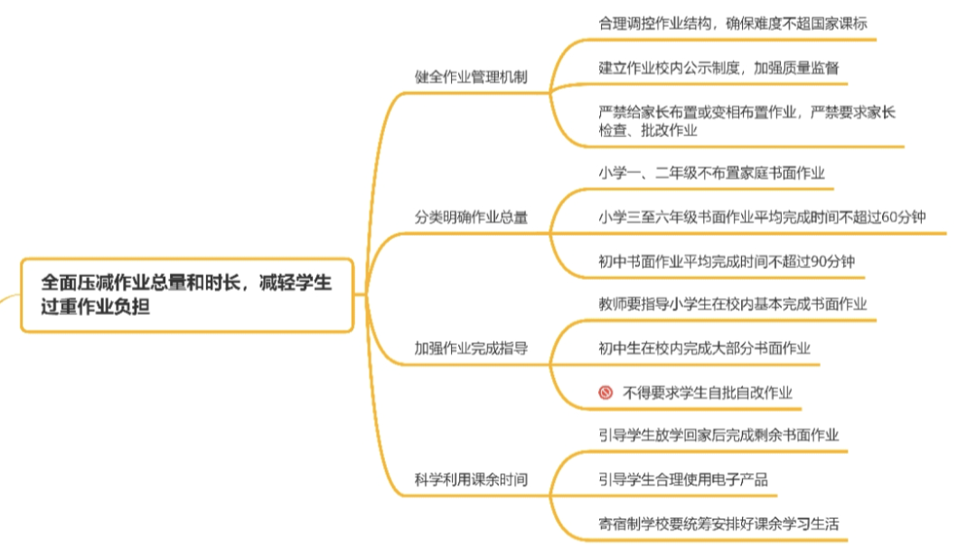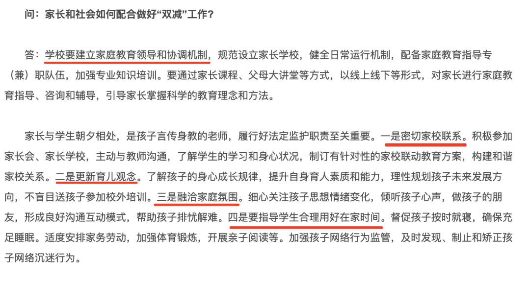 对父母关系比较大的,应该就是严禁学校给家长布置作业、严禁要求家长检查、批改作业,小学一二年级没有家庭书面作业,小学三到六年级书面作业平均完成时间不超过60分钟,并且对科学利用课余时间提出规范等等。我相信如果家里有大年级孩子的家长,可能对检查、批改和修订作业无比苦恼,这次国家从制度上,直接提出了反对。