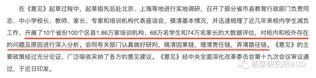 《意见》的起草过程也花了很长的时间,起草组先后去了北京、上海等地调查,开展的评估数据覆盖了100个区县1.86万家培训机构、68万名学生和74万名家长,还有部分省市县教育行政部门负责同事、中小学校长、教师、 家长、专家和培训机构代表。在中央全面深化改革委员会第十九次会议上,《意见》得到审议通过。▼