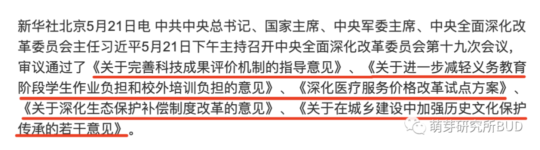 中央全面深化改革委员会第十九次会议是在今年5月21日召开的,那天下午一起通过审议的,还涉及到科技领域、医疗服务、生态保护、城乡建设等不同的指导意见。▼