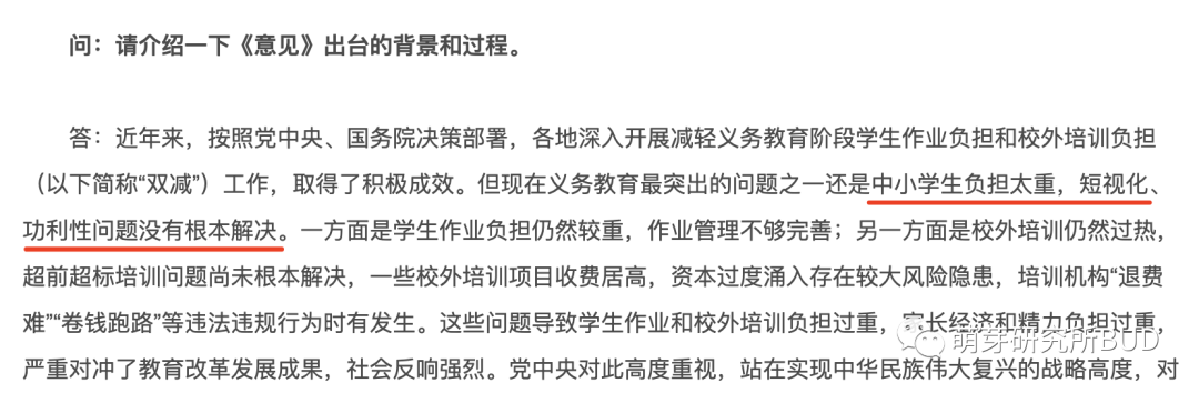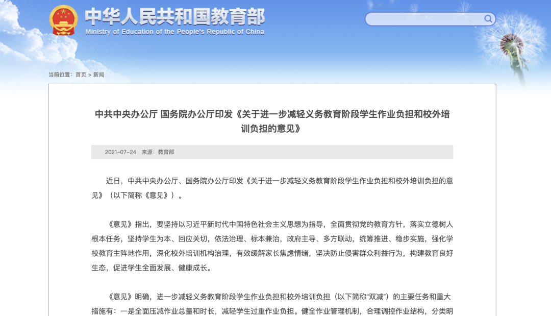 早上好啊,我相信大家应该也看到前段时间中共中央办公厅、国务院办公厅印发的《关于进一步减轻义务教育阶段学生作业负担和校外培训负担的意见》(简称《意见》)了。